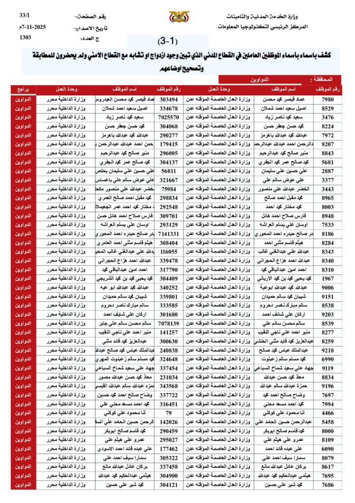 عدن .. وزارة الخدمة المدنية والتأمينات تعلن كشوفات الازدواج الوظيفي في القطاعين المدني والعسكري