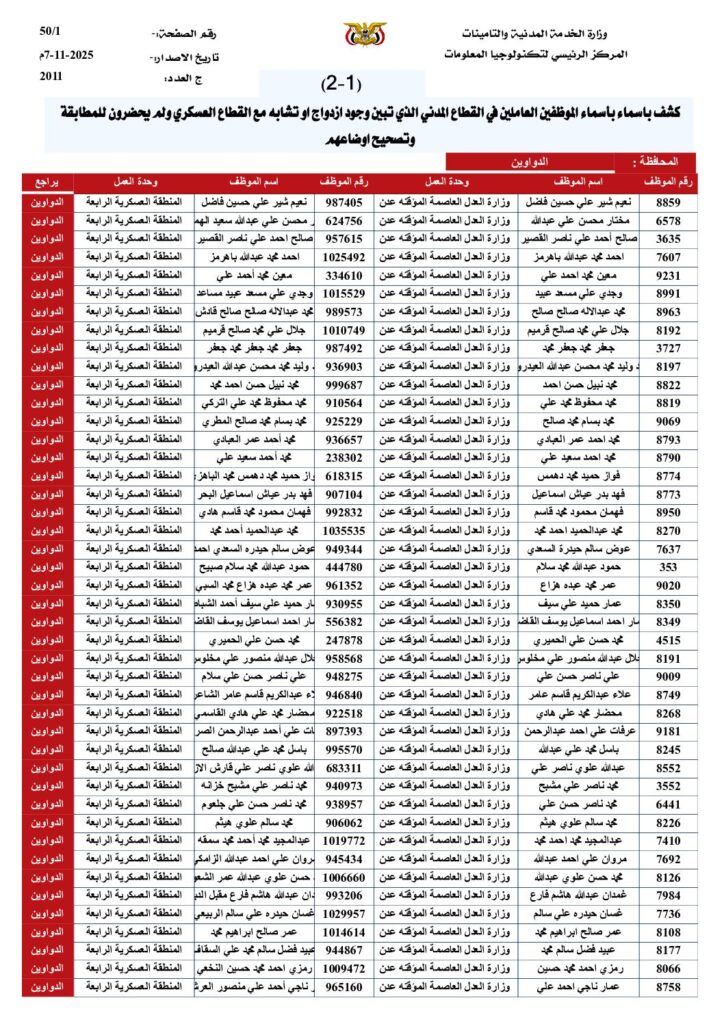 أعلنت وزارة الخدمة المدنية والتأمينات في العاصمة المؤقتة عدن كشوفات الموظفين المزدوجين في القطاعين العام المدني والعسكري.